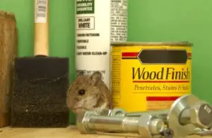 A mouse sits on a table surrounded by a paintbrush, paint can, wood finish, and various bolts, against a green background.
